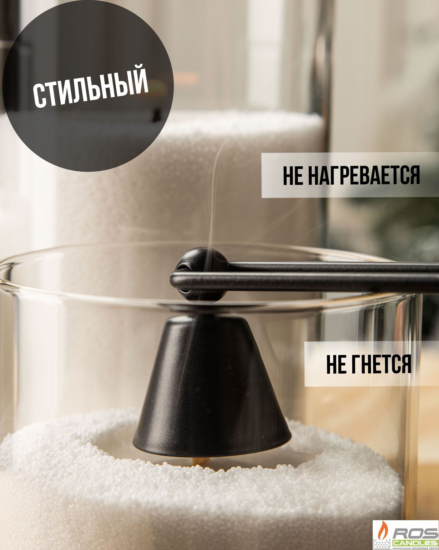 Аксессуары для тушения горящей свечи ROScandles минималистичного дизайна изготовлены из нержавеющей стали, не гнутся и не нагреваются.