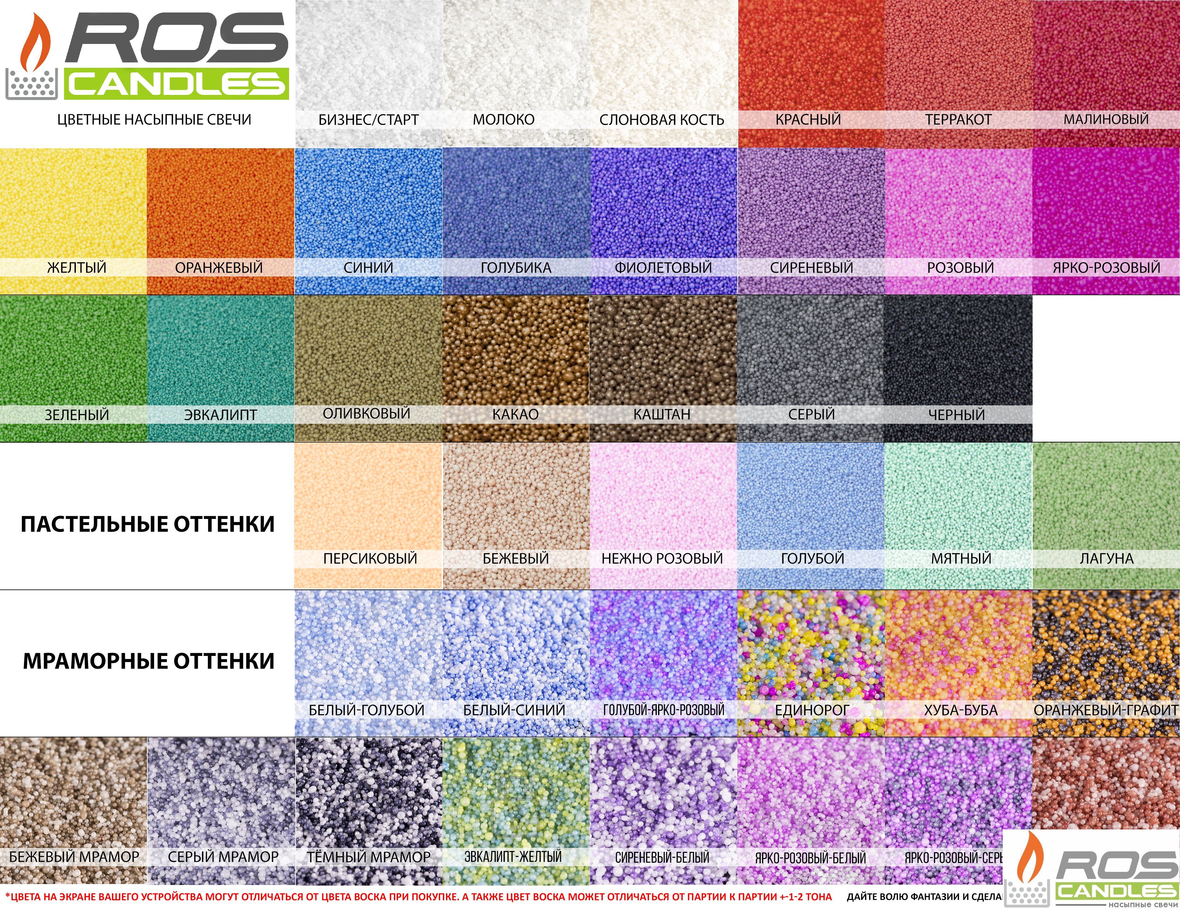 В нашем ассортимента 32 оттенка цветного воска. Вы можете обратиться к нашим менеджерам, чтобы мы сделали для Вас насыпные свечи тех цветов, которые ещё не представлены на сайте. Палитру цветов можно посмотреть на фото в карточке товара.