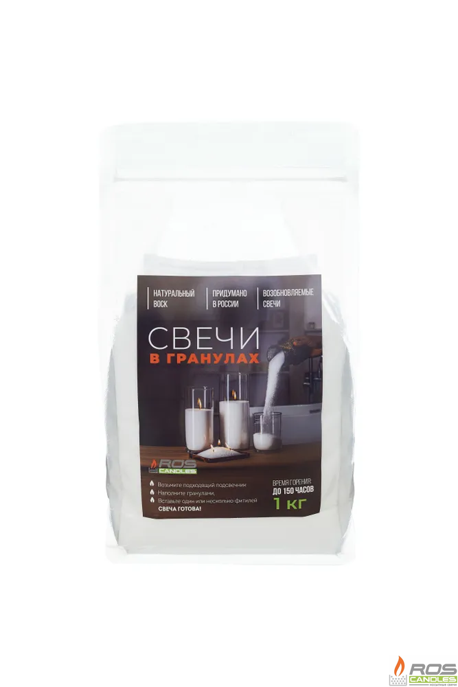 Чтобы сделать свечи своими руками: насыпьте гранулы в стеклянный подсвечник или любую огнеупорную емкость, вставьте фитиль, чтобы он выступал на 5мм над уровнем гранул, и зажгите. Свеча готова! После тушения свечи дайте воску остыть и удалите огарок.